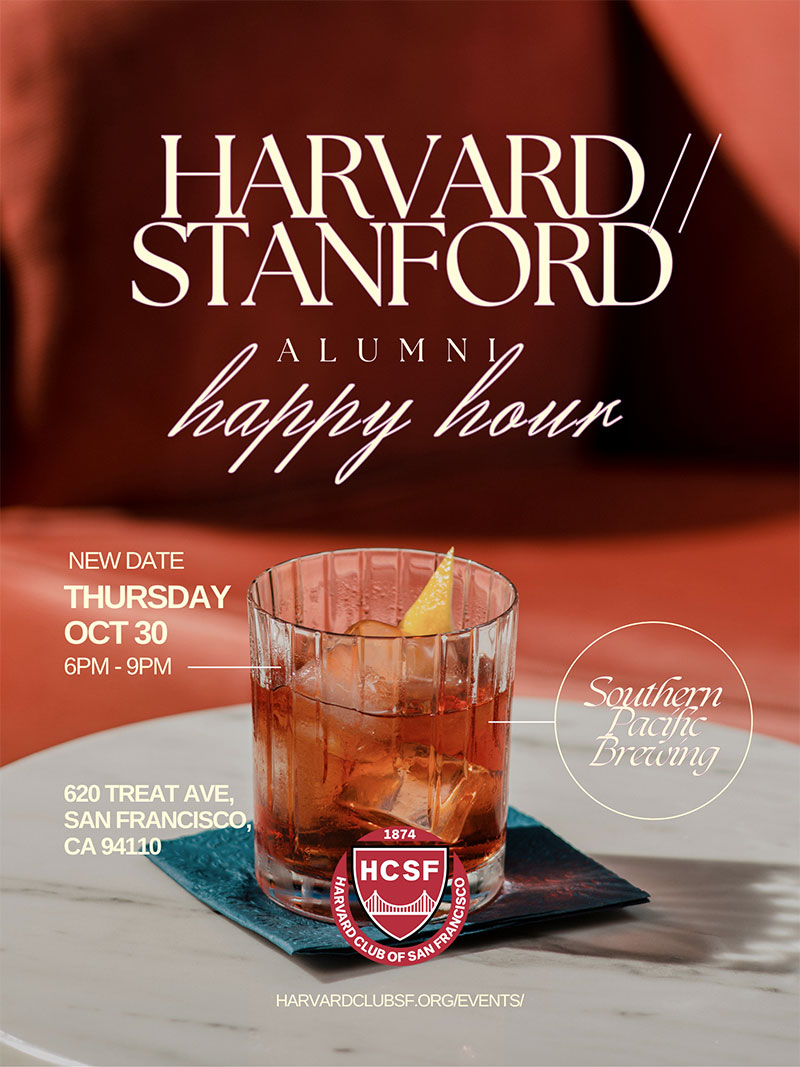 Join fellow Stanford and Harvard alumni for a lively evening of networking and camaraderie at our joint Happy Hour on October 30!